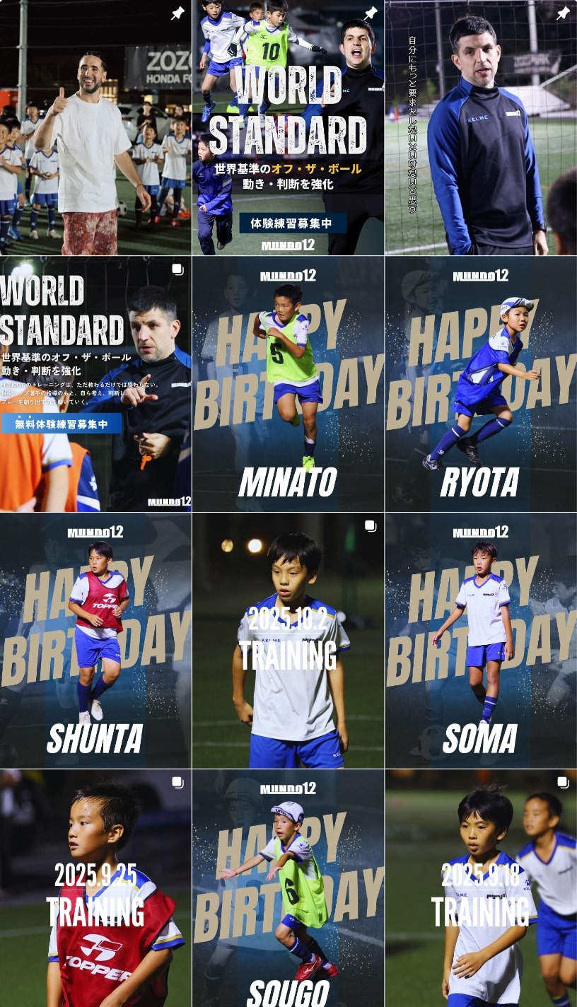 日々のトレーニング風景やイベント、遠征などの様子をビジュアルで発信し、選手や保護者、サッカーファンが一体となって成長を共有できる空間をデザイン。スクール後にはトレーニング内容の振り返り投稿を行い、選手の理解促進やモチベーション向上に寄与しています。また、スクール生の誕生日にはオリジナルのバースデー画像を投稿し、チームとしての一体感を演出。大会やイベント時にはハイライト動画やフォトギャラリーを定期的に配信することで、MUNDO12の活動をリアルに伝える発信設計を構築しました。