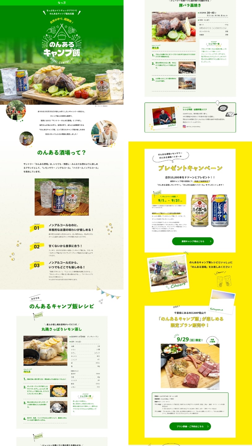 キャンプ場検索・予約サイトの特集ページ制作しました。ブランドの爽やかさとアウトドアの開放感を両立させるため、緑を基調にしたデザインで自然の心地よさを表現。レシピ紹介・キャンペーン情報・体験レポートを横断的に配置し、閲覧しながら「作ってみたい」「行ってみたい」と感じられるストーリー設計としました。また、写真やレイアウトには“手づくり感”や“リアルなキャンプの空気”を重視。製品訴求ではなく「体験を楽しむ」トーンで、ブランド価値を自然に伝える構成に仕上げています。